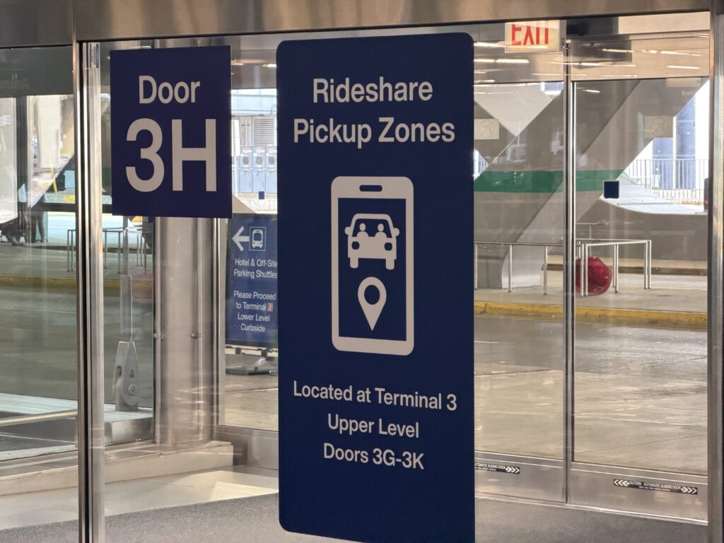 ちなみに、Uber/Lyft で市内へ向かう場合は、ターミナル3なら Baggage claim の 39A の近くに、下のような案内があります。