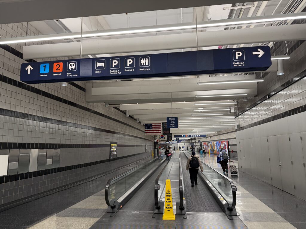 案内に従ってしばらく行くと、動く歩道が出てきます。アメリカらしく歩道は止まっていたりしますが、構わず進みます。