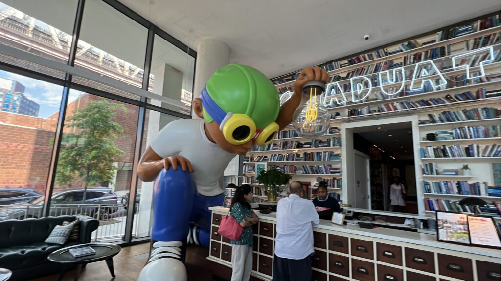 フロントはド派手!巨大少年がランプを照らしてこっちを見下ろしています。本棚にはたくさん本が並んでいます。