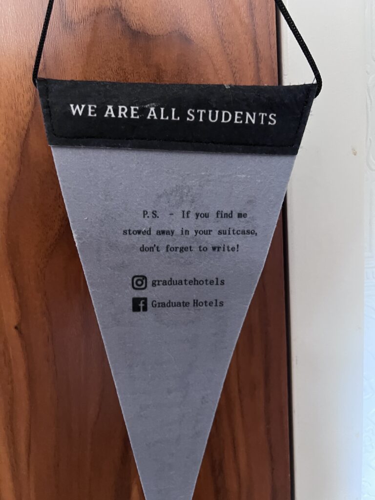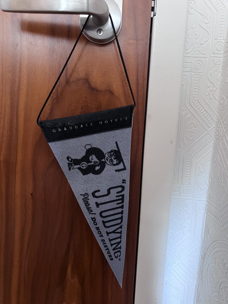 Graduate Hotel はアメリカの名門大学キャンパスに位置しているのですが、そのためか学生というのがキーワードコンセプトになっています。Do not disturb のサインがおしゃれです。