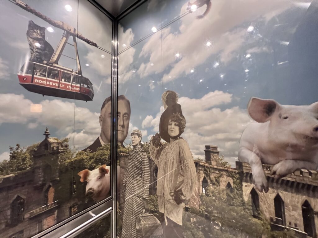 ド派手なエレベーター。やはりケーブルカーはルーズベルト島の象徴なのですね。右側のリスが電線を歩いて渡っているのはニューヨークの風物詩です。