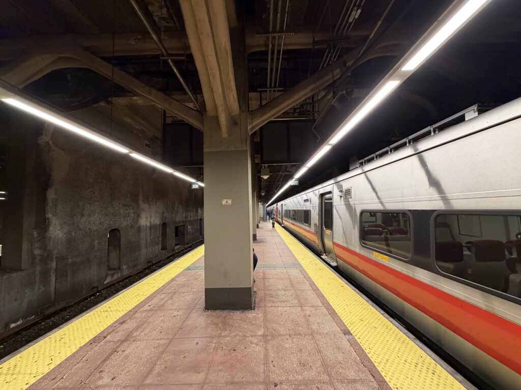 ホームの中はこのように暗いです。気にせず乗ります。この赤い線の電車が Metro-North です。