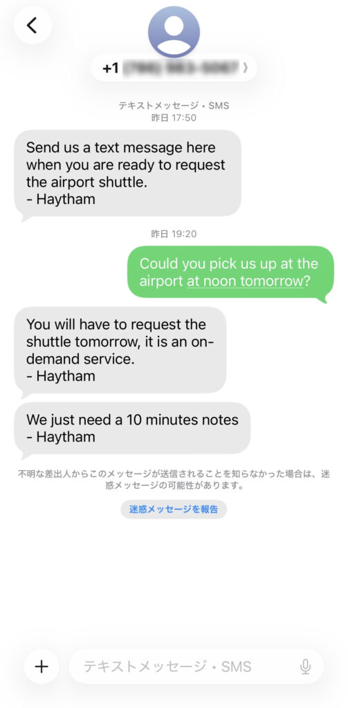 - 空港までの送迎は、メッセージで予約します(直前にのみ予約可)